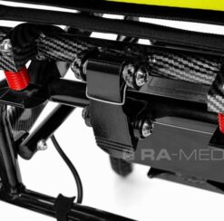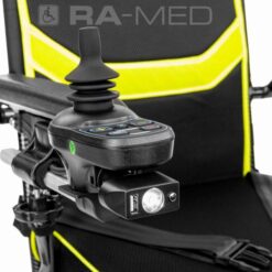 - Moduł sterowania – wyposażony w przycisk włącz/wyłącz, podświetlenie przycisków, joystick do precyzyjnego sterowania, klakson, przyciski regulacji prędkości, przycisk wyciszający oraz wskaźnik stanu naładowania akumulatora.