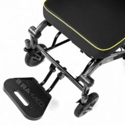 - Pas bezpieczeństwa oraz koła antywywrotne – dodatkowe zabezpieczenie użytkownika przed upadkiem oraz zwiększenie stabilności wózka.
