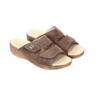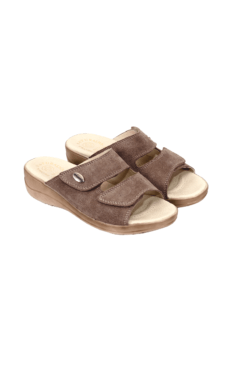 Obuwie damskie ręcznie szyte na koturnie, ze spodami przeciwpoślizgowymi. Posiadają widocznie zaznaczony profil ortopedyczny m.in. pelota na płaskostopie poprzeczne. Licowa wyściółka i cholewka ze skóry zamszowej. Możliwość regulacji tęgości za pomocą rzepów. Produkt Polski.